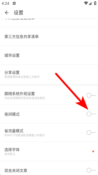 3、在設置頁找到夜間模式開關,點擊開啟夜間模式功能。