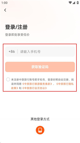 4、在登錄注冊界面填寫手機號碼,準備點擊獲取驗證碼繼續后續操作。