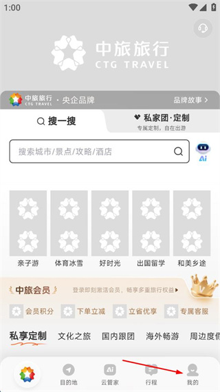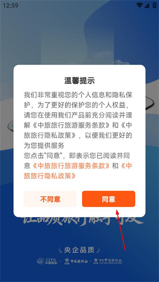 1、打開中旅旅行出現溫馨提示彈窗,閱讀相關條款后點擊同意按鈕進入軟件。
