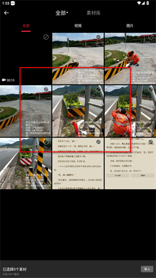 2、進入素材選擇界面,從手機相冊里挑選想要用于制作視頻的圖片或視頻片段,完成選擇后點擊導入。