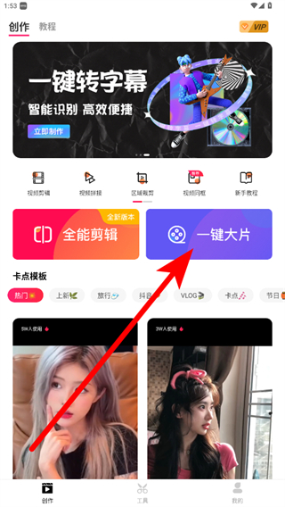 1、打開愛剪輯應用,在創作界面中,點擊一鍵大片選項。