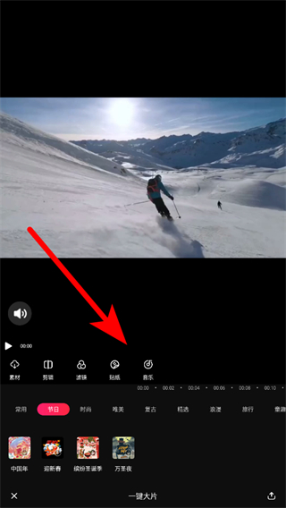 3、視頻進入編輯界面后,可點擊貼紙等功能選項,為視頻添加貼紙、濾鏡、音樂等元素來豐富視頻內容。