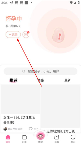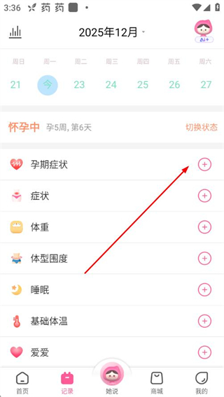 2、進入記錄頁面后,找到孕期癥狀并點擊右側的+。
