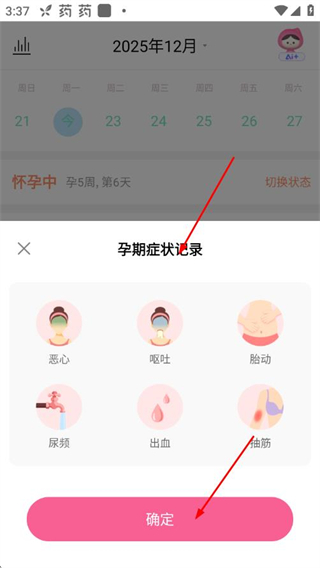 3、在孕期癥狀記錄彈窗中選擇對應癥狀,點擊確定。