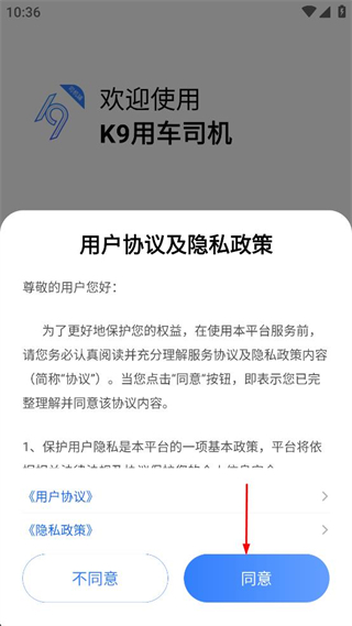 1、打開K9用車司機軟件,彈出用戶協議及隱私政策彈窗,閱讀后點擊同意按鈕。