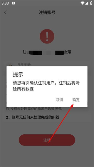 4、在彈出的提示窗口中,點擊確定按鈕,完成賬號注銷。