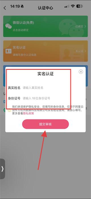 4、在填寫框中輸入真實姓名和身份證號,點擊提交審核,即可完成撿對象APP的實名認證流程。