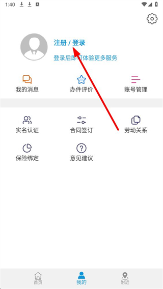 2、在我的界面中,找到注冊登錄區域并點擊,進入登錄相關的操作頁面。