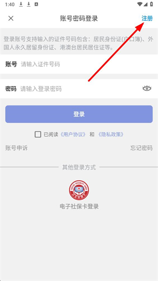 3、在登錄頁面的右上角,找到注冊按鈕并點擊,進入電子社??ㄗ缘男畔⑻顚懡缑妗?