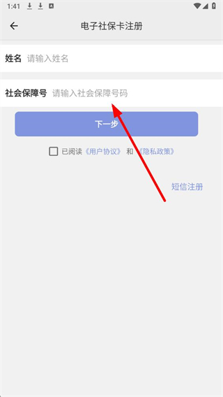 4、在注冊界面輸入姓名、社會保障號,勾選協議后點擊下一步,后續按提示完成注冊操作。