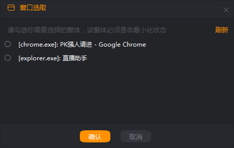 直播伴侶在窗口選取彈窗中能讀取你電腦上打開的所有頁面,選中想要直播的窗口點擊確認即可將窗口添加至直播窗口列表。(為了程序正常讀取窗口,請保證待讀取窗口非最小化)。