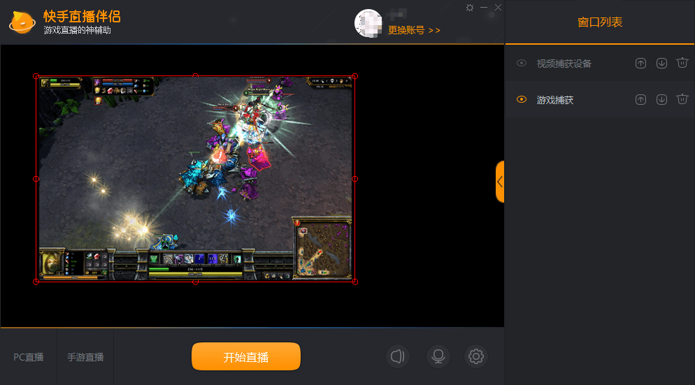 4.點擊游戲選擇按鈕,彈出游戲選擇框,快手直播伴侶會自動識別你已經安裝并打開過的游戲。雙擊可以啟動未打開的游戲或者將已經打開的游戲添加至直播窗口,此時將游戲放到全屏,直播伴侶便可直接讀取游戲頁面到已添加的窗口。