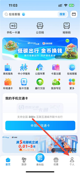 1、在北京一卡通app界面底部,找到個人選項并點擊,進入個人頁面。