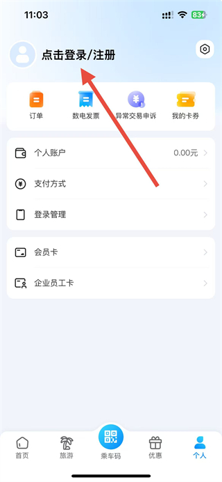 2、在個人頁面,找到點擊登錄注冊區域并點擊,進入登錄界面。