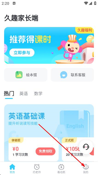 1、打開久趣家長端APP,點擊底部導航欄的我的。