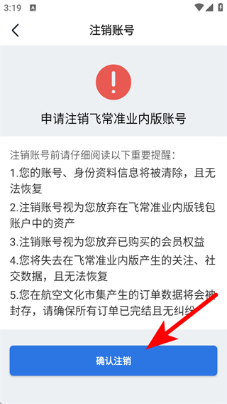 4、閱讀注銷提示后,點擊確認注銷按鈕,完成飛常準賬號的注銷。