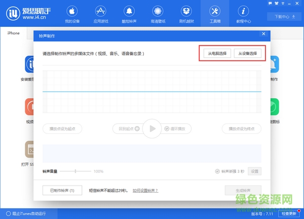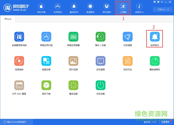 一、打開愛思助手,將移動設備連接到電腦,點“工具箱-鈴聲制作”進入鈴聲制作界面;