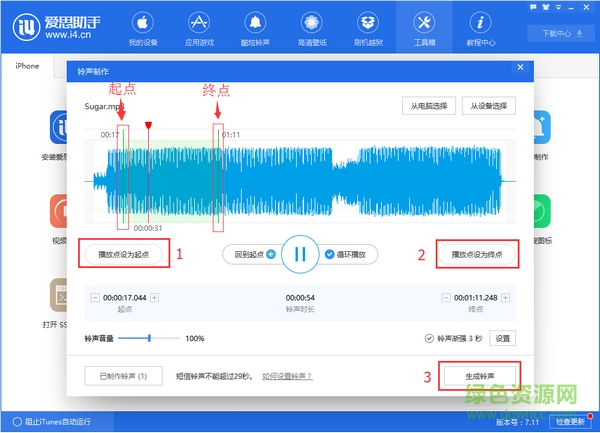三、在試聽時點“播放點設為起點”和“播放點設為終點”或 拖動起點和終點來確定鈴聲的區間,之后點擊“生成鈴聲”來制作鈴聲;