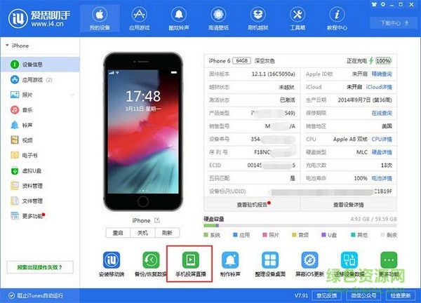 安裝完以后將設備連接到電腦。此時您可以在愛思助手【我的設備】最下方找到【手機投屏直播】工具,請點擊打開;