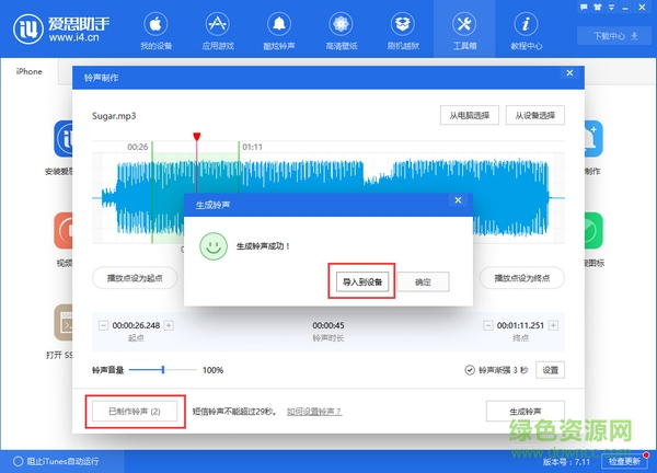 四、生成鈴聲成功后點擊“導入到設備”即可將制作的鈴聲導入到移動設備中,已制作的鈴聲可以在左下角查看。