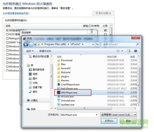 5、若列表中找不到【愛思助手AirPlayer投屏工具】,點擊【允許運行另一程序】路徑瀏覽找到愛思助手客戶端安裝目錄添加【i4AirPlayer.exe】,添加完以后重新連接即可;