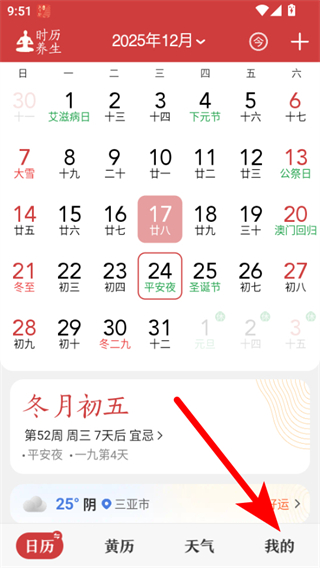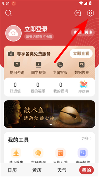 1、打開中華萬年歷app,點擊底部的我的選項進入個人中心頁面。