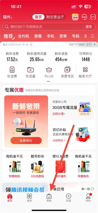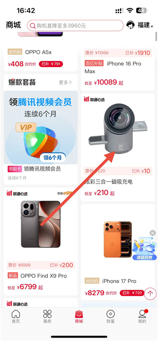 1、進入中國聯通應用,點擊底部導航欄的商城選項,進入商城頁面。