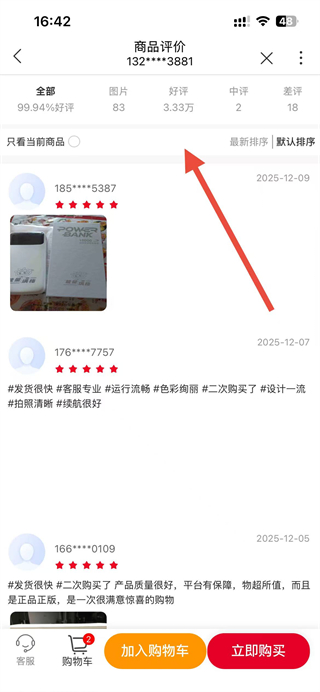 4、在商品評價頁面,可查看全部、圖片、好評等分類下的評價內容,還能切換排序方式瀏覽。