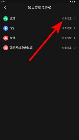 5、進入第三方賬號綁定頁面后點擊微信右側的點擊綁定,按照提示完成微信賬號的綁定操作。