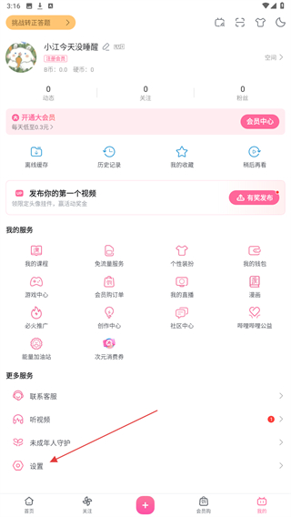 2、在我的頁面中,找到并點擊設置按鈕,進入設置頁面。