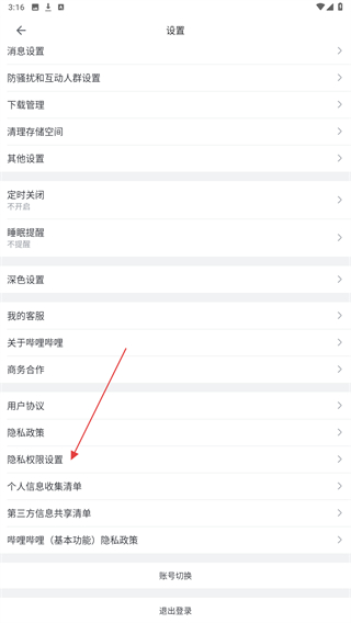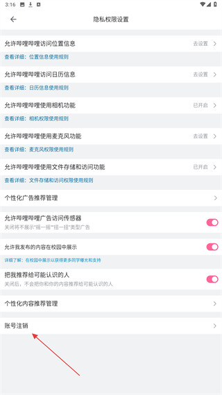 4、在隱私權限設置頁面中,找到賬號注銷選項,即可注銷。