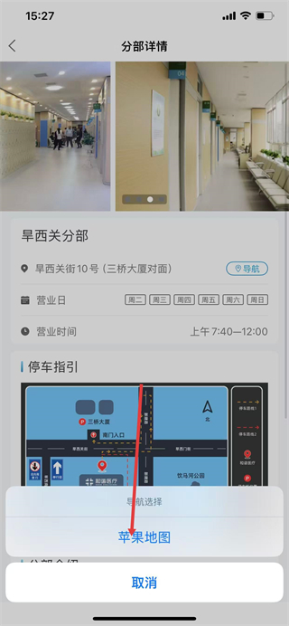 3、在彈出的導航選擇中,選擇對應的地圖應用,即可查看醫院地址并導航。