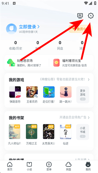 1、打開uc瀏覽器進入我的頁面,找到右上角的設置圖標并點擊進入更多設置界面。