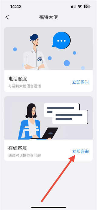 3、進入福特大使頁面后,在顯示的選項里找到在線客服模塊,點擊其對應的立即咨詢按鈕。