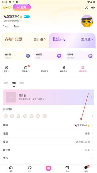3、在個人資料頁面中,點擊當前昵稱區域,進入修改昵稱的操作頁面。