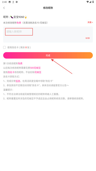 4、在輸入框中填寫想要更換的新昵稱,點擊完成按鈕即可完成。