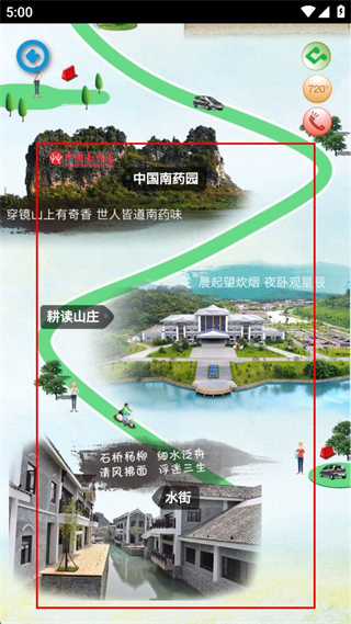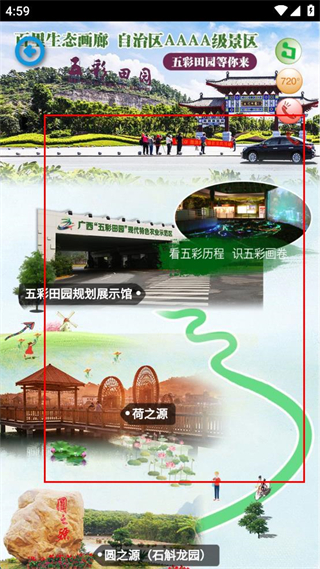 4、繼續向下滑動頁面,查看中國南藥園耕讀山莊水街等剩余的五彩田園景點信息。