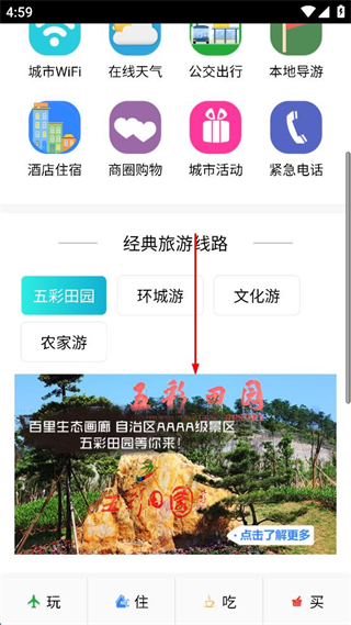 1、打開旅游服務軟件,進入主頁面后,找到經典旅游線路板塊,選擇五彩田園選項。