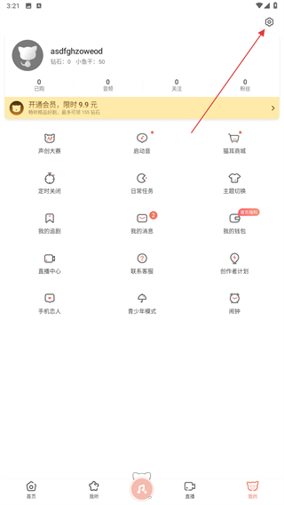 2、進入我的頁面內,點擊右上角設置的功能按鈕。