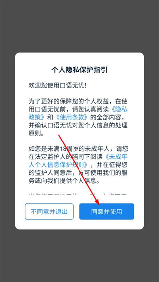 1、打開口語無憂,在彈出的提示框中點擊同意并使用。