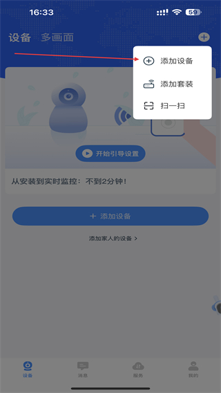 2、在右上角彈出的菜單欄,點擊添加設備。
