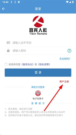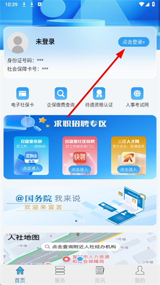 1、打開宜賓人社APP后,在首頁找到點擊登錄按鈕并點擊,進入登錄相關界面。