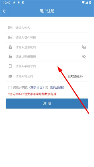3、在注冊頁面依次填寫信息,獲取并填寫驗證碼后勾選協議,點擊注冊完成操作。