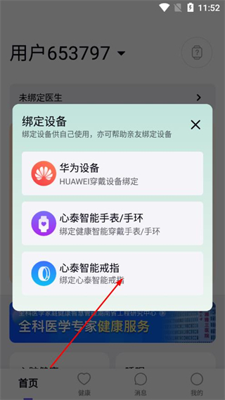 1、打開心泰健康APP首頁,點擊右上角的設備圖標。