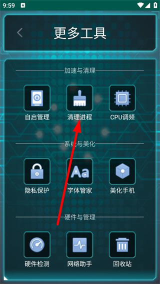 2、進入更多工具頁面,找到并點擊清理進程選項。