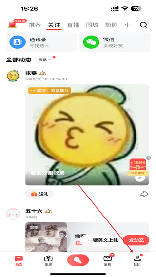 1、打開全民K歌APP,通過微信/QQ登錄進行登錄,登錄后即刻到首頁的頁面。