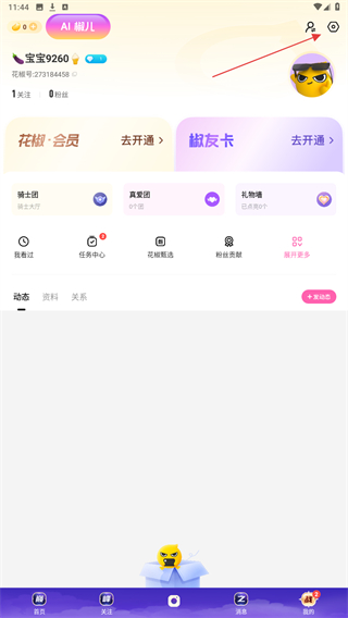 1、打開花椒直播APP,進入我的頁面,點擊右上角的設置圖標,進入設置界面。