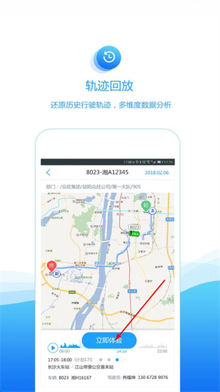 1、進入軌跡回放頁面,查看頁面展示的歷史行駛軌跡信息,點擊立即體驗按鈕進入登錄界面。