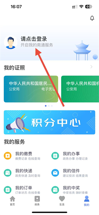 2、在個人頁面中,找到請點擊登錄區域并點擊,進入南通市統一身份認證平臺的登錄界面。