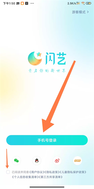 3、在登錄選擇頁面,點擊手機號登錄選項并勾選同意協議,進入手機號登錄信息填寫界面。